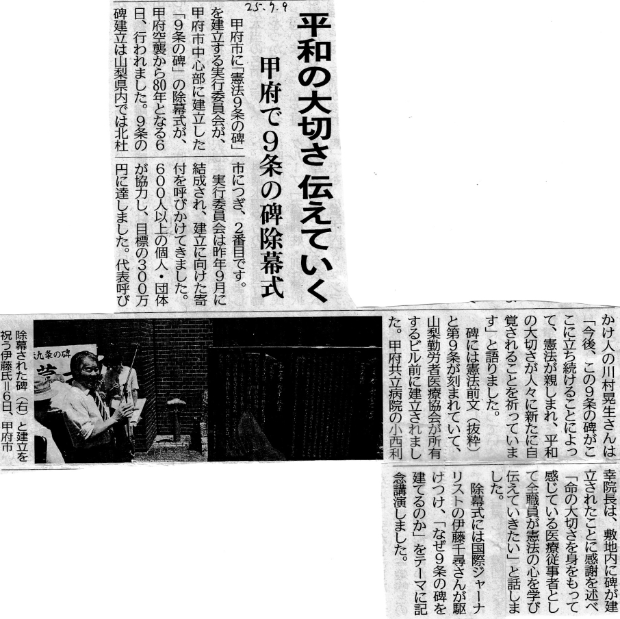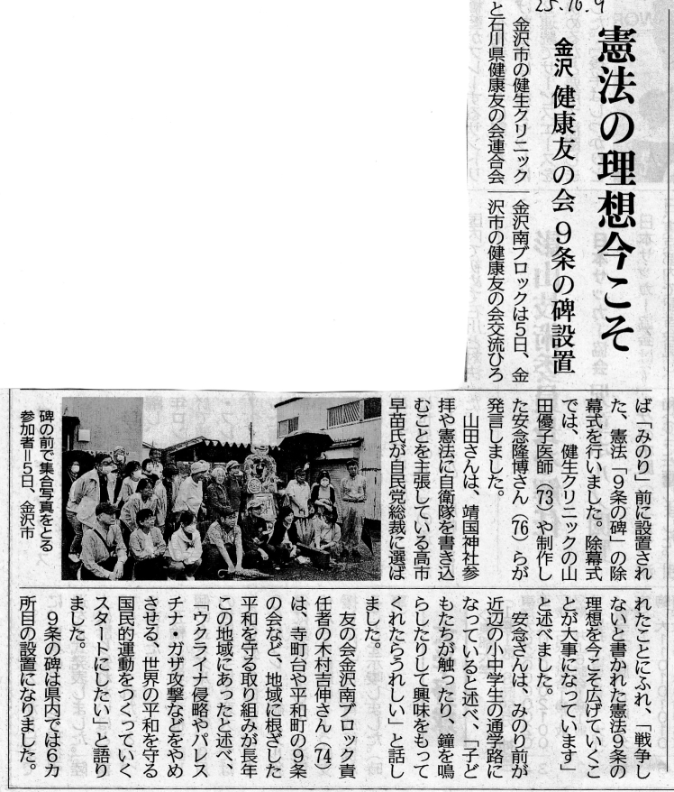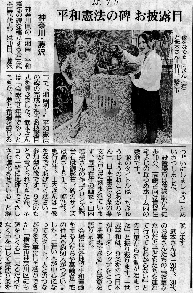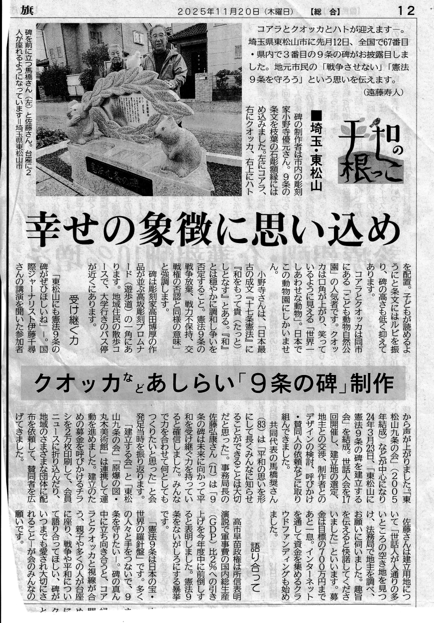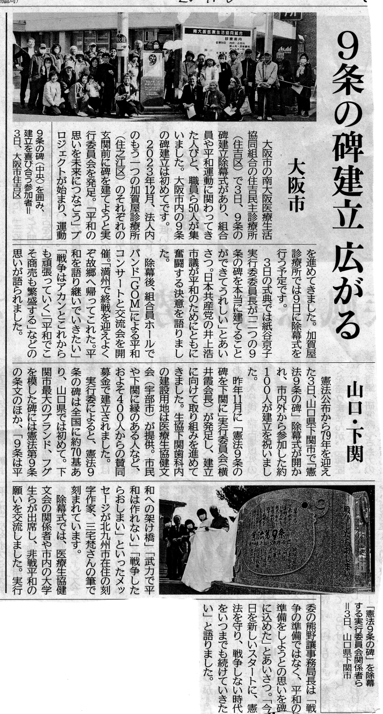 | 北海道室蘭市で 「9条の碑」除幕式 | 2023年11月3日 NHK 北海道ニュース 新聞記事 |