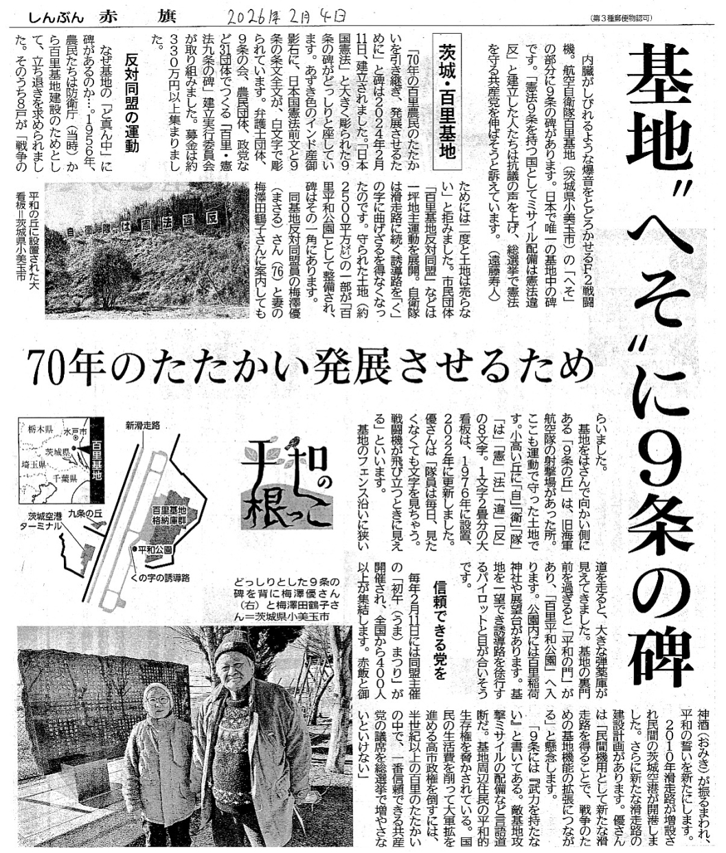 碑文 自衛隊は憲法違反 百里農民の信念を引き継ぐ ここ百里ヶ原に明治時代に入植した農民は、稲作には適さない荒れ地を手作業で開墾しました。 戦後は満州から引き揚げてきた人々が開拓農民として入植し、地元の農民とともに「基地」を農地に ところが一九五六年、航空自衛隊基地の誘致が起こると事態は一変しました。農機具ひとつなく来年の 「基地」建設に反対する農民は、憲法九条に反する自衛隊基地建設は無効であると、一九五八年から 「百里基地」反対運動は、「自衛隊は憲法違反」の大看板を設置し、「一坪地主」運動の力で誘導路を 私たちは、平和的生存権を脅かし、憲法九条二項の「陸海空軍その他の戦力」に当たる自衛隊は違憲 建立に際しては、多くの団体・個人の賛同を得ました。 二〇二四年二月一一日 「百里・憲法9条の碑」建立実行委員会 |